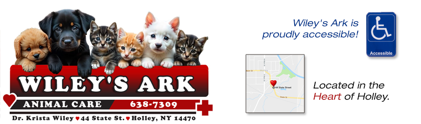 Rochester Veterinary Relief Services. For the next two years she worked at nearly 20 area practices as an independent contractor. In 2003, she started Wiley’s Ark Animal Care, which was actually located in 630 square feet of her home. In 2005, the business was flourishing and moved to 44 State Street, a refurbished 2200 square foot building in the commercial district in Holley. The building had previously been a liquor store, a dental office, a computer store, a gift shop, and many other businesses. With the help of her husband, Kerri, and several friends and family members, she rehabilitated the entire building. Wiley’s Ark Animal Care became incorporated in 2007 and is now Wiley’s Ark Animal Care P.C.
